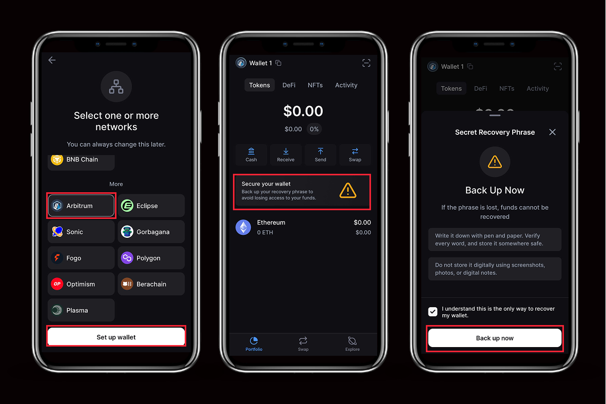 Protect your recovery phrase. Your recovery phrase controls your wallet across all EVM networks. Store it offline, never share it, and never save it digitally.