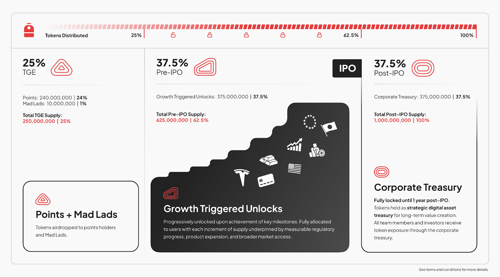User-first distribution. Circulating supply before IPO belongs to the community rather than insiders.