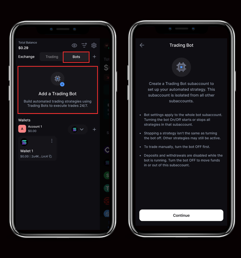 On mobile, Grid Bots are managed through a Trading Bot sub-account that contains all automated strategies.
