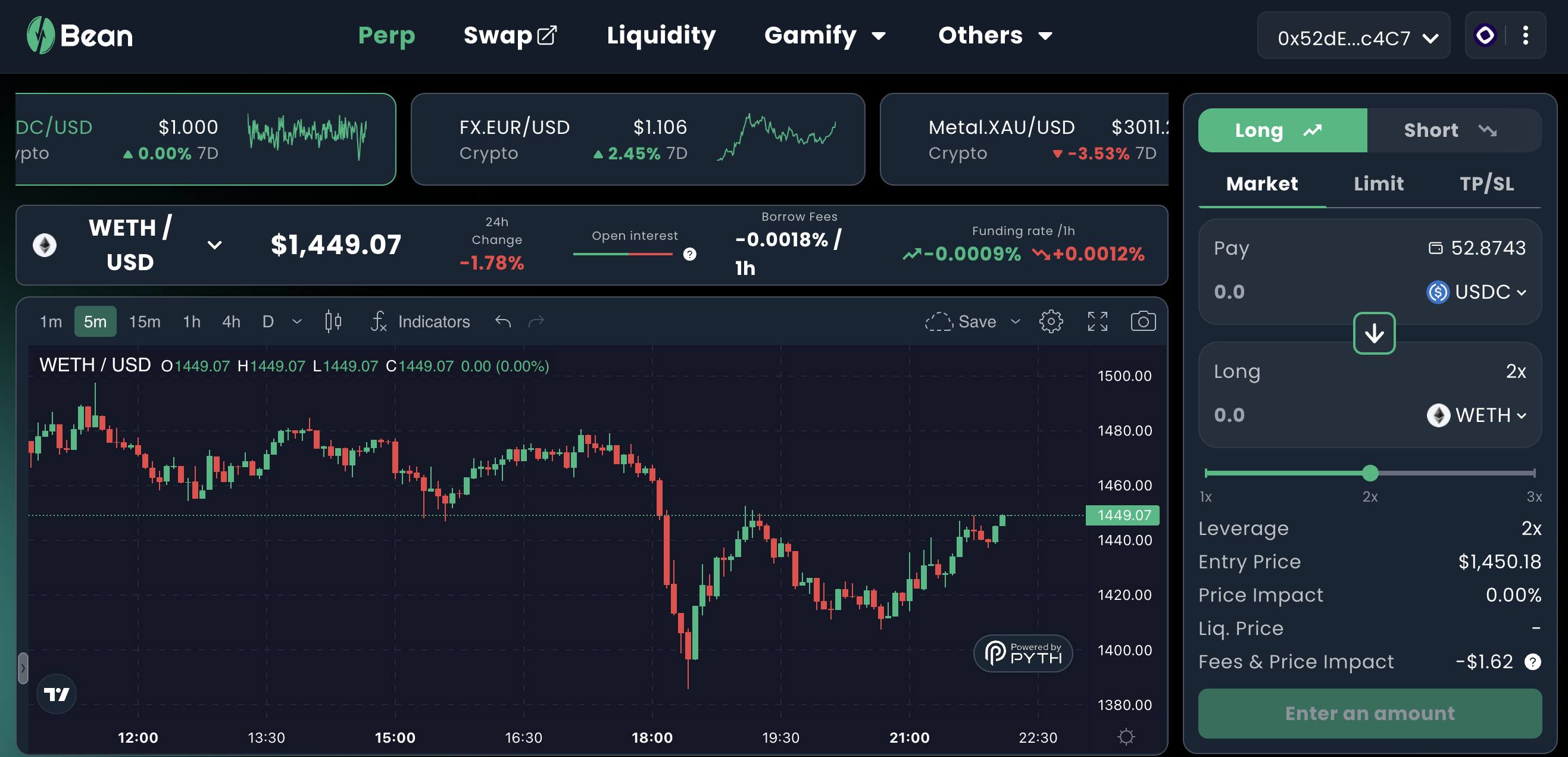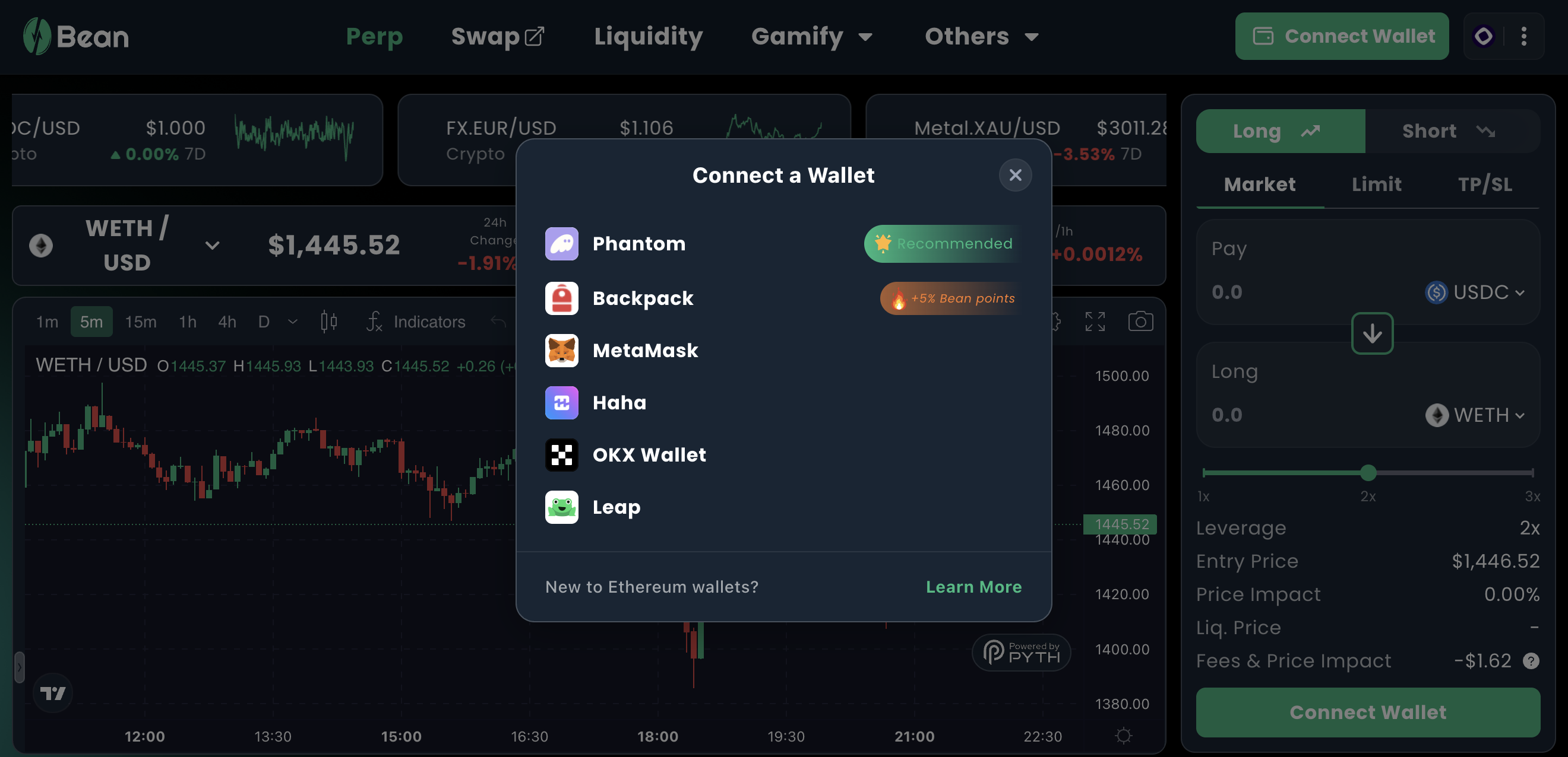 Beyond typical crypto pairs, Bean DEX supports synthetic assets like XAU/USD and EUR/USD with leverage—offering new strategies and exposure.