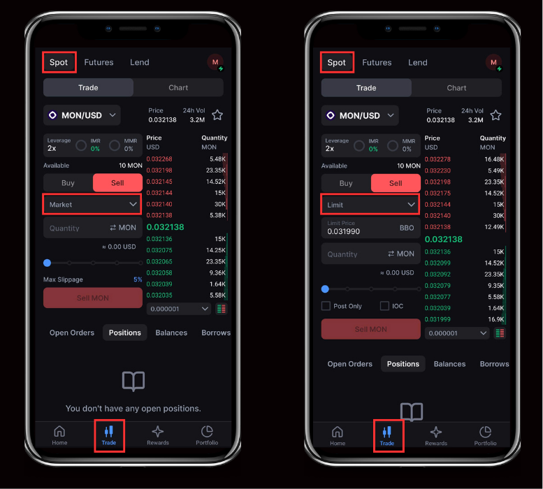 - Once your MON deposit arrives, go to the Trade section and click the Spot tab.