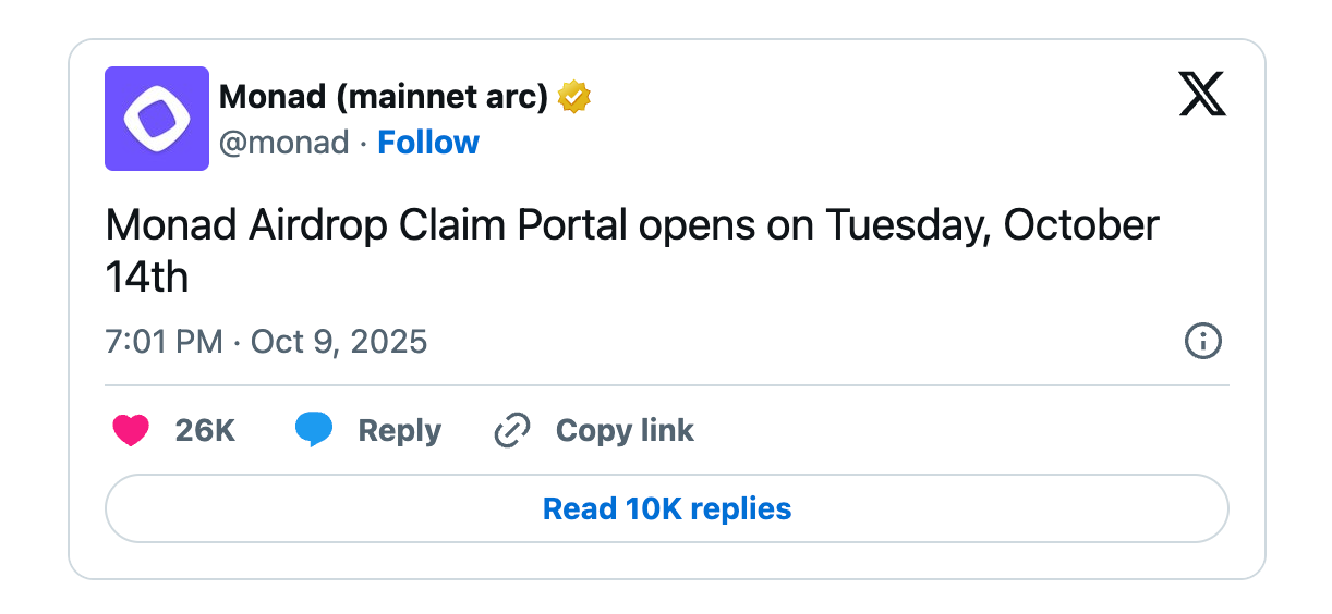 Monad, an upcoming high‑performance Layer‑1 blockchain, recently confirmed on X that its long‑anticipated native token airdrop will open for claims on October 14. The announcement marks a major milestone in the project’s roadmap but leaves out many details, including who qualifies, how much each user will receive and any vesting schedules.