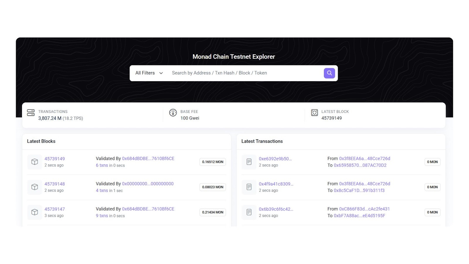 Monad Scan is a blockchain analytics and explorer tool for the Monad Testnet. It allows you to confirm whether transactions have been successfully processed and monitor the real-time health of the Monad network.