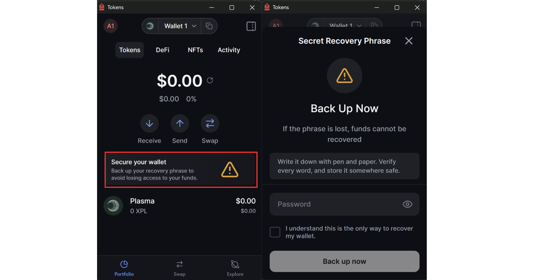 Complete setup: Your wallet is ready to use, with USD₮0, XPL and other Plasma tokens supported.