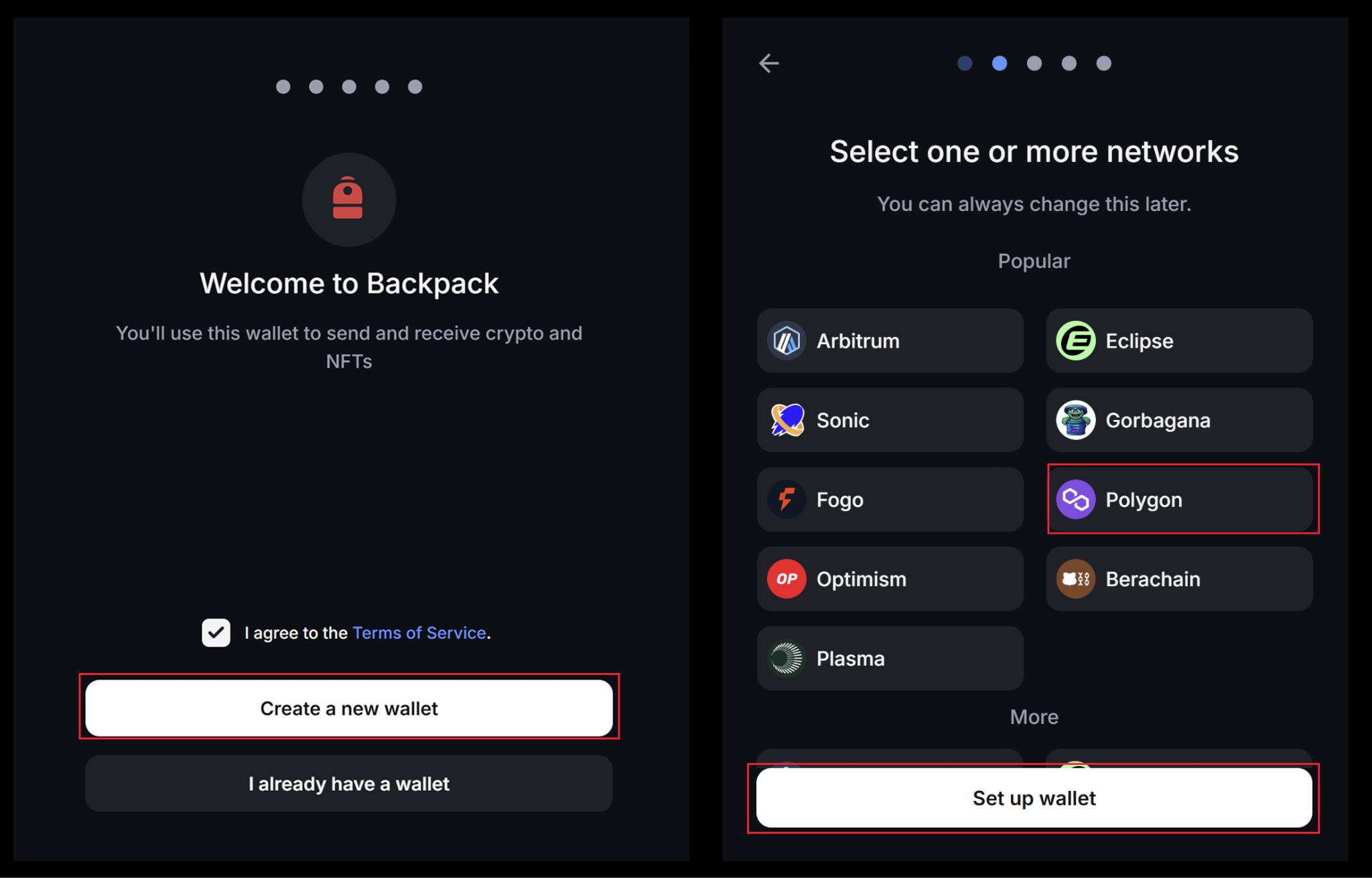 In most EVM wallets, you need to add Polygon through network settings. Some multi-chain wallets, such as Backpack, support Polygon by default, allowing users to switch networks without manual setup.