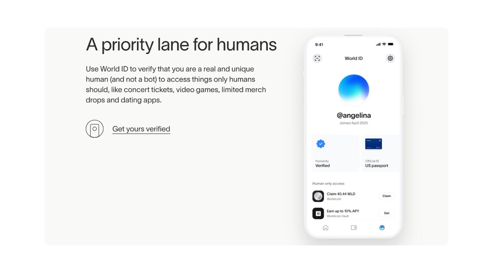 Users get WLD tokens for scanning their eyes. New US users receive 16 WLD tokens (~$17) for completing iris verification, while early adopters get 150 WLD (~$155).