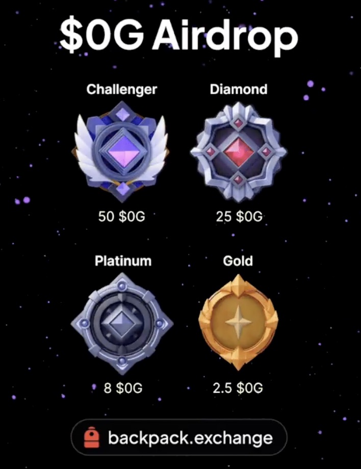 With the launch of 0G, Backpack badge holders are getting an exclusive airdrop. No sign-ups or forms, tokens will land directly in eligible accounts. The higher the badge tier, the bigger the reward. Ranks unlock access to bonus rewards, this time with 22K $0G.]